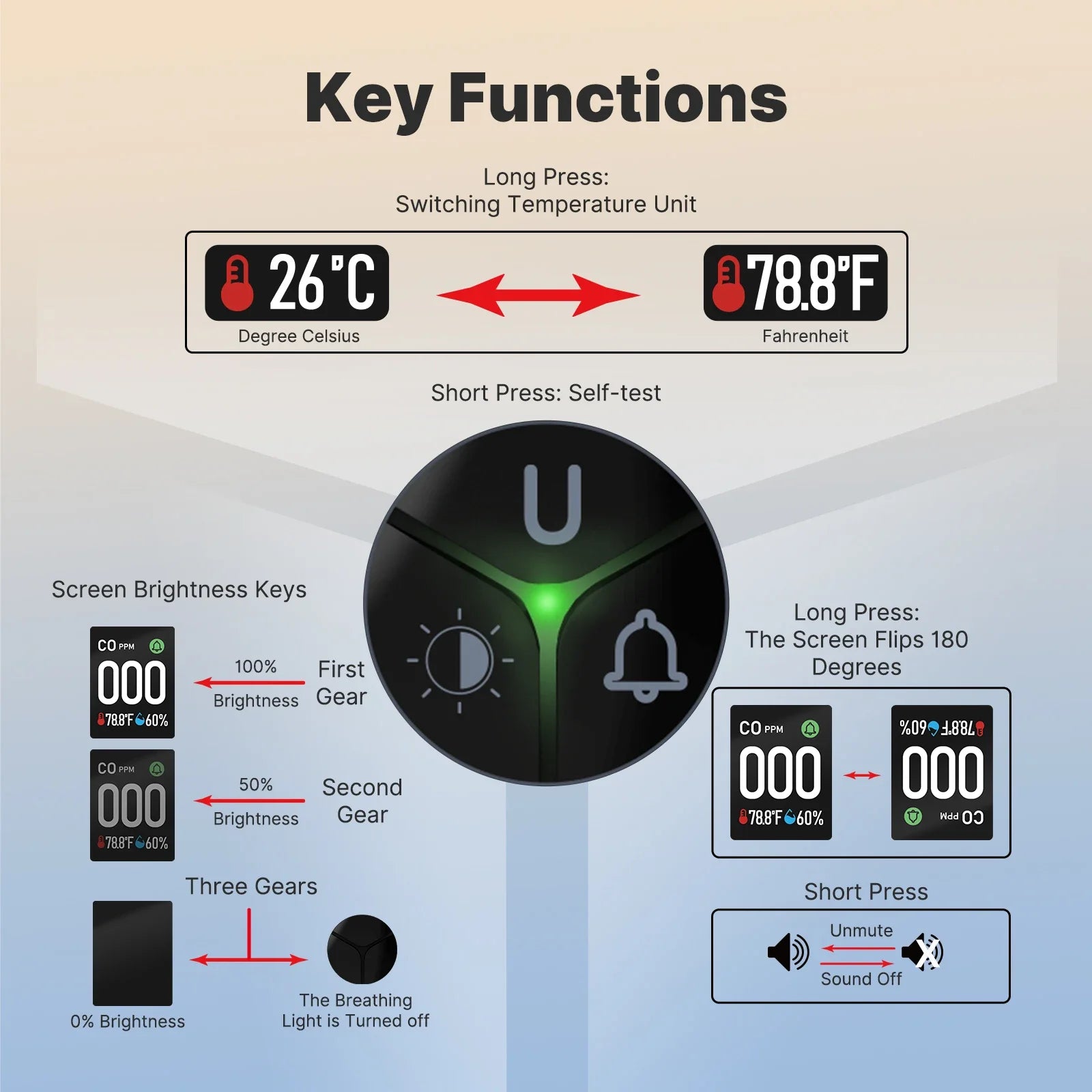 Use the buttons to switch temperature units, flip the screen, and adjust brightness—quick and easy control at your fingertips.